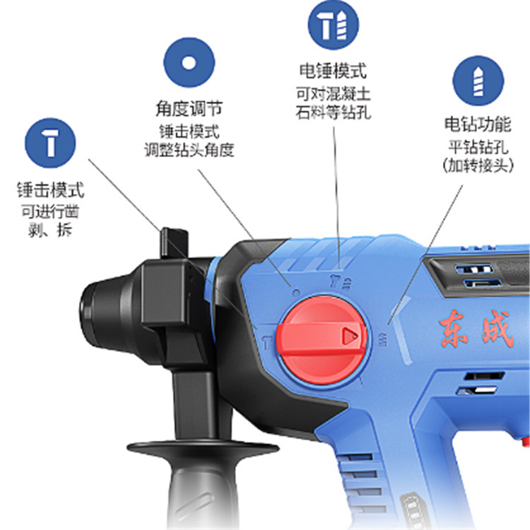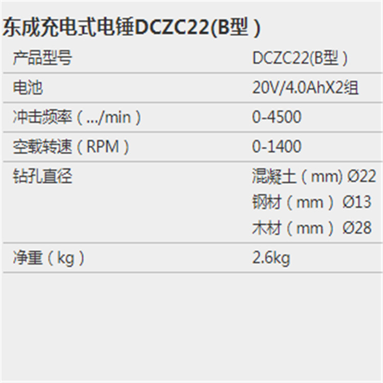 - 东成充电式电锤DCZC22(B型)  - 东成电锤稳定可靠的安全离合器:又称转矩限制离合器,避免在使 - 用过程中因钻头的卡滞而产生的大转矩反作用力传递给用户,这 - 是对使用者的一种安全保护。  - 东成电锤专业在墙面,混凝土,石材上面进行打孔,还有多功能电锤,调节 - 到适当位置配上适当钻头可以代替普通电钻,电镐使用。  - 东成充电式电锤DCZC22(B型),产品参数如图。