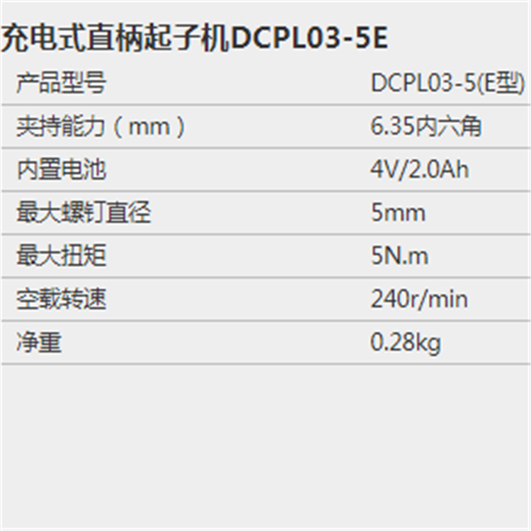 东成充电式直柄起子机DCPL03-5E,产品参数如图。