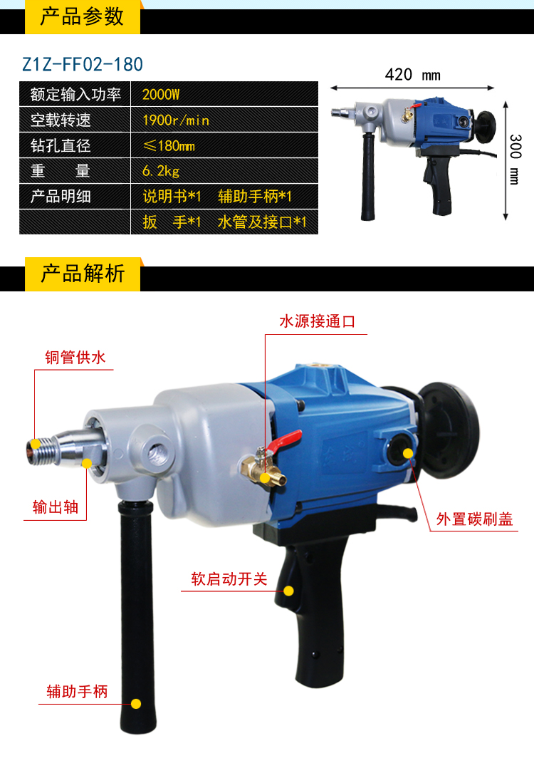 东成金刚石钻孔机Z1Z-FF02-180/Z1Z-FF02-180S配件齐全,工友首选