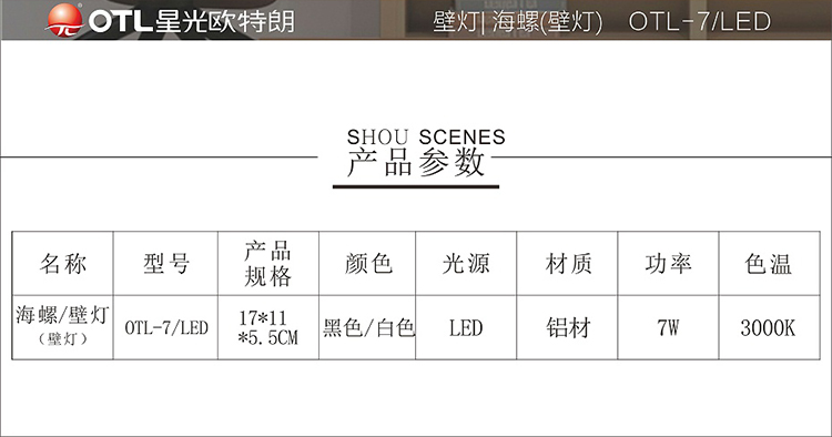 欧特朗OTL-7/LED -海螺/壁灯|卧室床头灯|别墅走廊灯分为黑色、白色两种,其余参数如图
